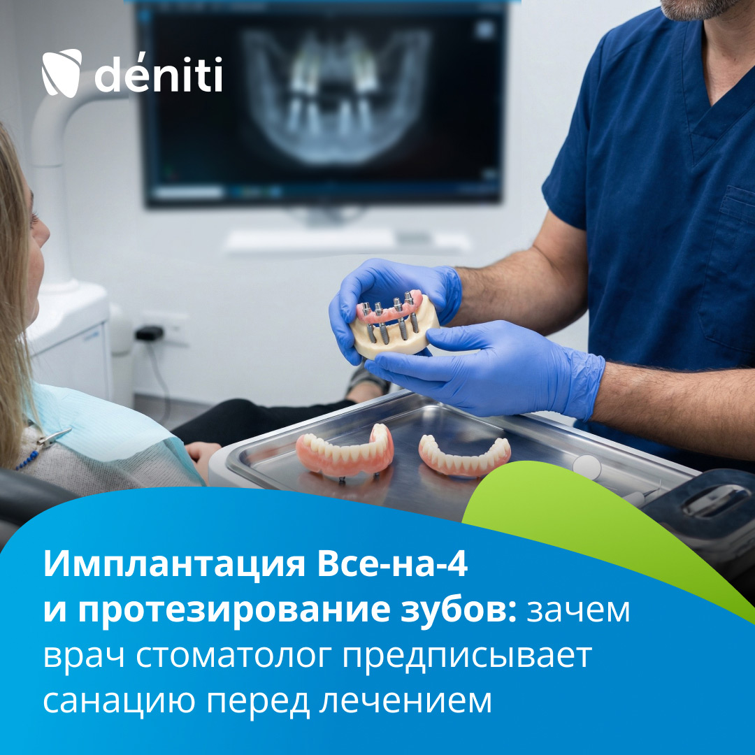 Санация — это комплексная подготовка, где стоматолог терапевт устраняет кариес и лечит пульпит, а стоматолог хирург оценивает очаги хронического воспаления. Параллельно проводится диагностический этап: оценка прикуса, распределения жевательной нагрузки, состояние костной ткани. Потому что микробная нагрузка, скрытые воспаления и перегрузки — главные причины осложнений после имплантации.