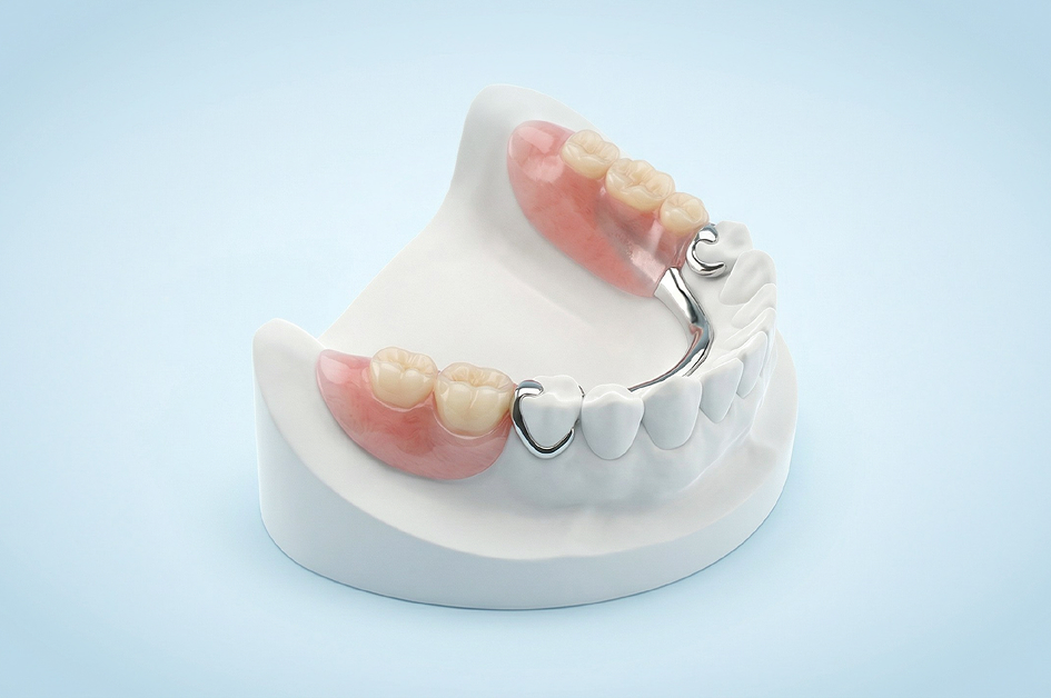 Также есть пластиковый базис, который имитирует десну. На нем закреплены искусственные зубы. Конструкция надежно крепится с помощью крючков или замков на живые опорные зубы — это один из лучших вариантов съемного протезирования.